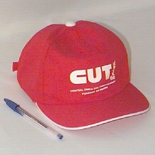 BONÉ EM TECIDO VERMELHO. NA FRENTE, ESTAMPA BRANCA COM A INSCRIÇÃO 'CUT / CENTRAL ÚNICA DOS TRABALHADORES / FUNDADA EM 28/08/83 / BRASIL'.