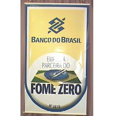 BANNER (99X170 CM), COM O SÍMBOLO DO PROGRAMA FOME ZERO E DO BANCO DO BRASIL, E A INSCRIÇÃO 'BANCO DO BRASIL / EMPRESA PARCEIRA DO FOME ZERO / Nº 0010'. ACONDICIONADO EM SACO PLÁSTICO.