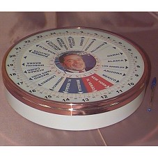 RELÓGIO (37X7,5 CM) INDICANDO HORÁRIO DE VÁRIOS PAÍSES, DE FORMATO CIRCULAR, COM CORPO EM ALUMÍNIO E LATÃO, TENDO AO CENTRO FOTO DO PRESIDENTE LUIZ INÁCIO LULA DA SILVA. ACONDICIONADO EM CAIXA DE PAPELÃO (38,5X38,5X7,5 CM), COM DESENHO DO OBJETO NA PARTE POSTERIOR E 'PRESIDENTE LULA'.