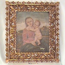 PINTURA (64X52 CM) A ÓLEO SOBRE TELA, DE UMA MULHER SENTADA, SEGURANDO UM BEBÊ, COM PAISAGEM BUCÓLICA AO FUNDO. PREDOMINA OS TONS DE VERMELHO, VERDE E MARROM. MOLDURA (94X84,5 CM) EM MADEIRA ESCULPIDA, FORMANDO ARABESCOS, PINTADA DE DOURADO. NO CANTO INFERIOR ESQUERDO, ASSINATURA 'EURIPEDES 2000'.