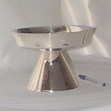 BOMBONIERE (14X19 CM), SEM TAMPA, EM PRATA 925, DE ESTILO PRÉ-HISPÂNICO. PRATO FIXADO EM BASE EM FORMA DE CONE. ACONDICIONADO EM SACO DE TECIDO FLANELADO DO FABRICANTE, E EM CAIXA ( 20,5X20,5X20 CM) AZUL MARINHO, TENDO NA TAMPA FITA COM LISTRAS VERDE, BRANCA E VERMELHA, E CARTÃO DO REMETENTE 'CON LOS SALUDOS DE VICENTE FOX QUESADA / PRESIDENTE DE LOS ESTADOS UNIDOS MEXICANOS'.